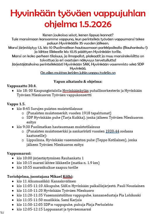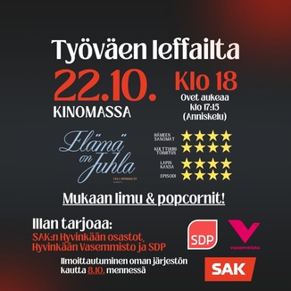 Tervetuloa SAK:laisten ammattiliittojen Hyvinkään osastojen, Hyvinkään vasemmiston ja SDP Hyvinkään yhteiseen työväen leffailtaan.