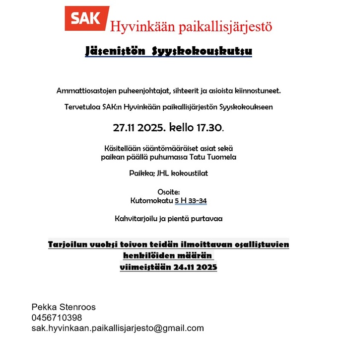SAK Hyvinkään paikallisjärjestön kevätkokous 2025
